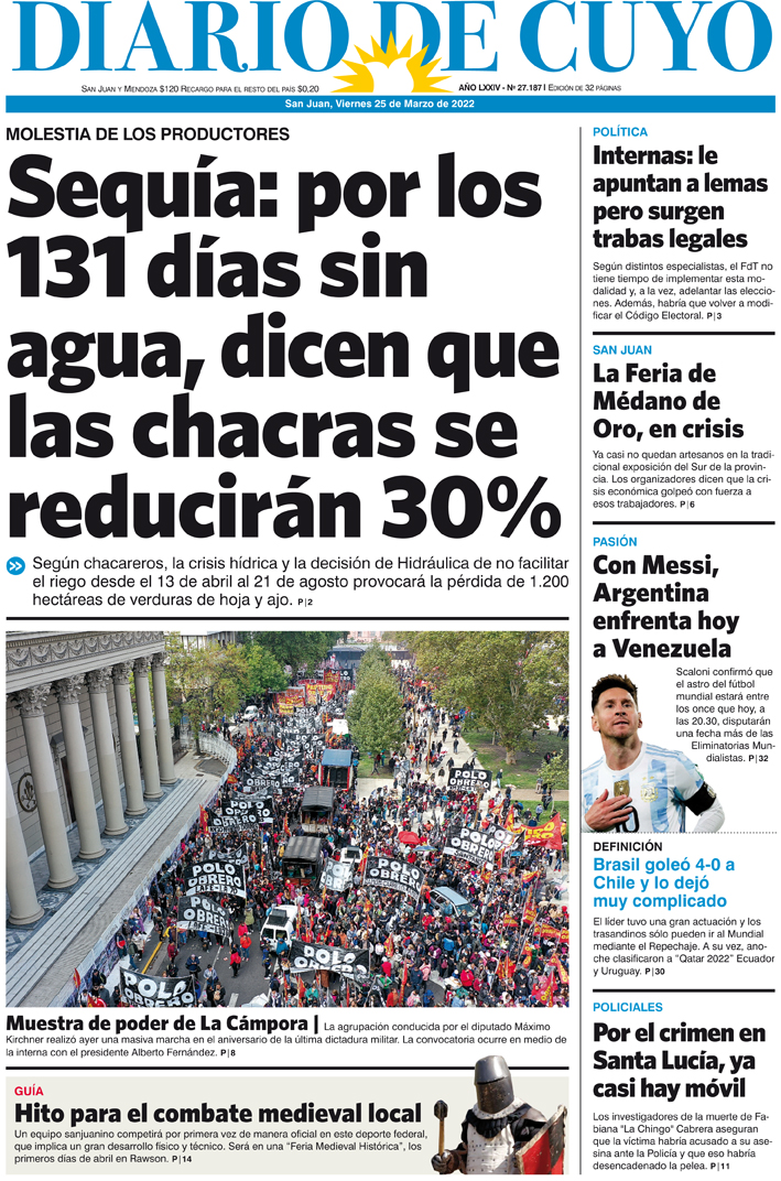 Diario de Cuyo | HOME | Noticias Tapa Edición 25 de Marzo del 2022 Por Redacción Diario de Cuyo 24/03/2022 · 0:00 Escuchar la noticia Escuchar la noticia Your browser doesn’t support HTML5 audio Ver los comentarios ›