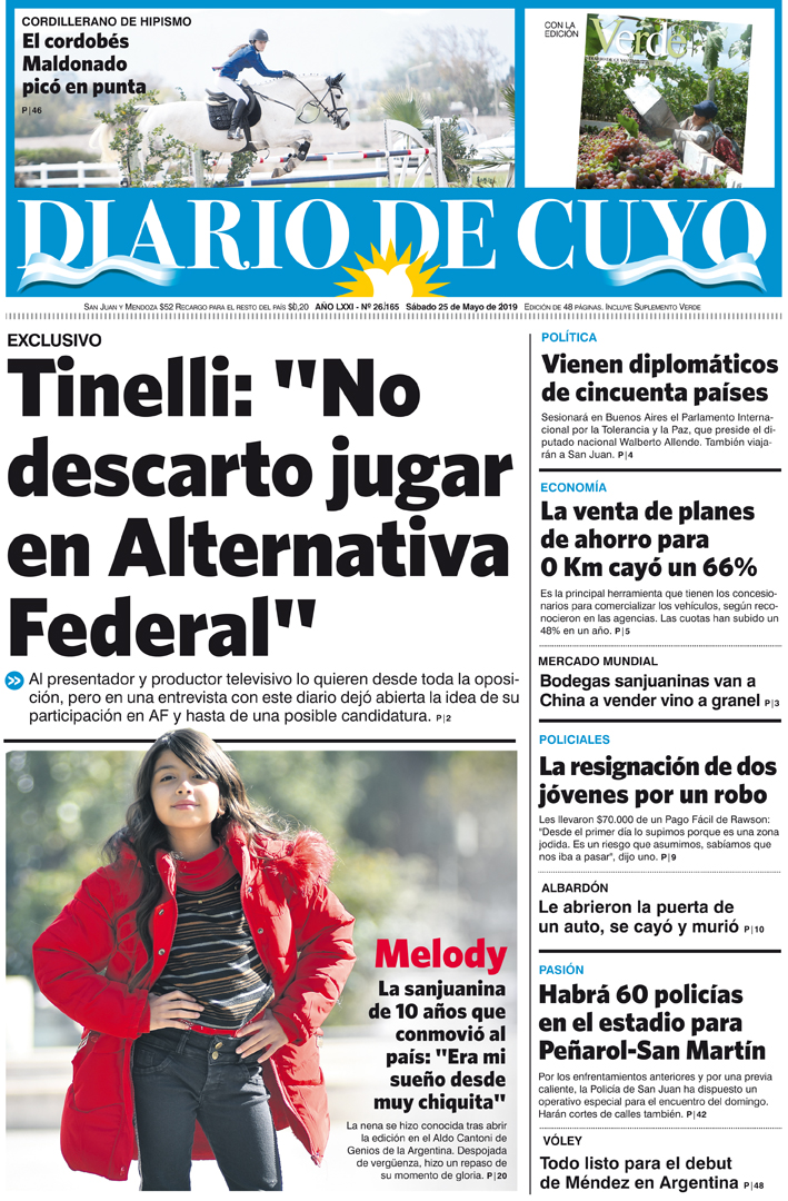 Diario de Cuyo | HOME | Noticias | Tapa Edición Tapa Edición 25 de Mayo 2019 Por Redacción Diario de Cuyo 25/05/2019 · 0:00 Escuchar la noticia Escuchar la noticia Your browser doesn’t support HTML5 audio Tapa Edición Ver los comentarios ›