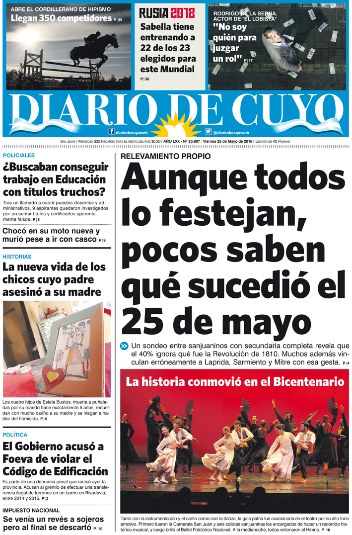 Diario de Cuyo | HOME | Noticias | Tapa Edición Tapa Edición 25 de Mayo de 2018 Por Redacción Diario de Cuyo 25/05/2018 · 0:00 Escuchar la noticia Escuchar la noticia Your browser doesn’t support HTML5 audio Tapa Edición Ver los comentarios ›