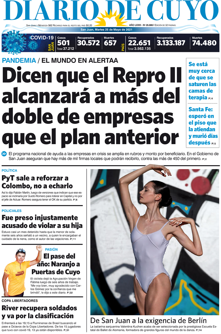 Diario de Cuyo | HOME | Noticias Tapa Edición 25 de Mayo del 2021 Por Redacción Diario de Cuyo 24/05/2021 · 0:00 Escuchar la noticia Escuchar la noticia Your browser doesn’t support HTML5 audio Ver los comentarios ›
