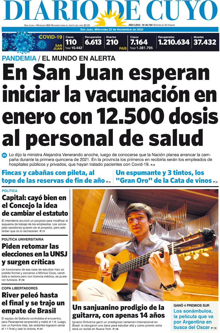 Diario de Cuyo | HOME | Noticias Tapa Edición 25 de Noviembre del 2020 Por Redacción Diario de Cuyo 24/11/2020 · 0:00 Escuchar la noticia Escuchar la noticia Your browser doesn’t support HTML5 audio Ver los comentarios ›
