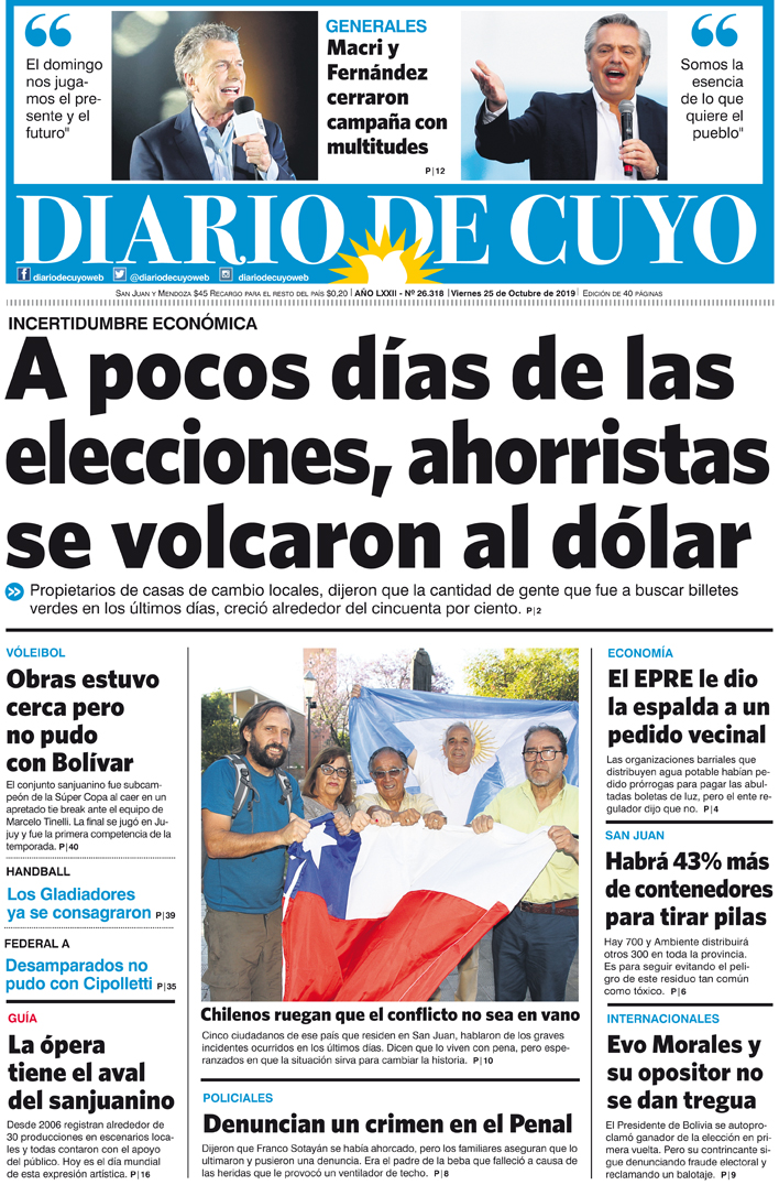 Diario de Cuyo | HOME | Noticias | Tapa Edición Tapa Edición 25 de Octubre 2019 Por Redacción Diario de Cuyo 25/10/2019 · 0:00 Escuchar la noticia Escuchar la noticia Your browser doesn’t support HTML5 audio Tapa Edición Ver los comentarios ›