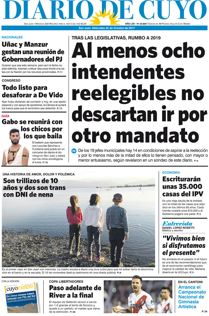 Diario de Cuyo | HOME | Noticias Tapa Edición 25 de Octubre de 2017 Por Redacción Diario de Cuyo 25/10/2017 · 0:00 Escuchar la noticia Escuchar la noticia Your browser doesn’t support HTML5 audio Ver los comentarios ›