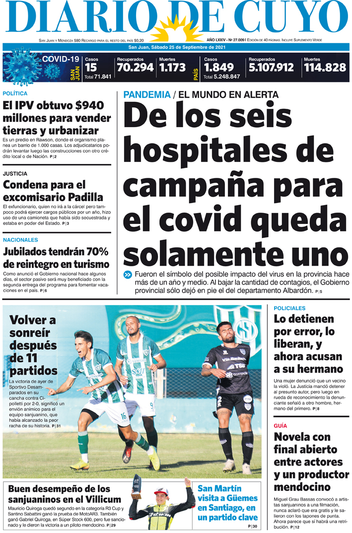 Diario de Cuyo | HOME | Noticias Tapa Edición 25 de Septiembre del 2021 Por Redacción Diario de Cuyo 24/09/2021 · 0:00 Escuchar la noticia Escuchar la noticia Your browser doesn’t support HTML5 audio Ver los comentarios ›