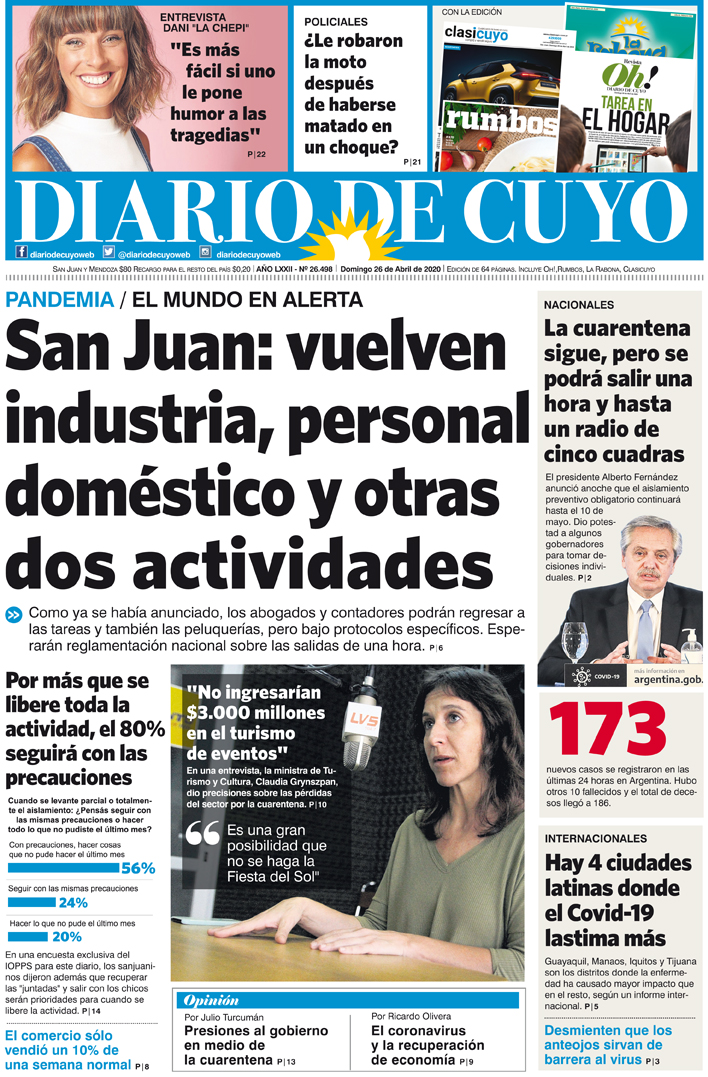Diario de Cuyo | HOME | Noticias | Tapa Edición Tapa Edición 26 de Abril de 2020 Por Redacción Diario de Cuyo 25/04/2020 · 0:00 Escuchar la noticia Escuchar la noticia Your browser doesn’t support HTML5 audio Tapa Edición Ver los comentarios ›