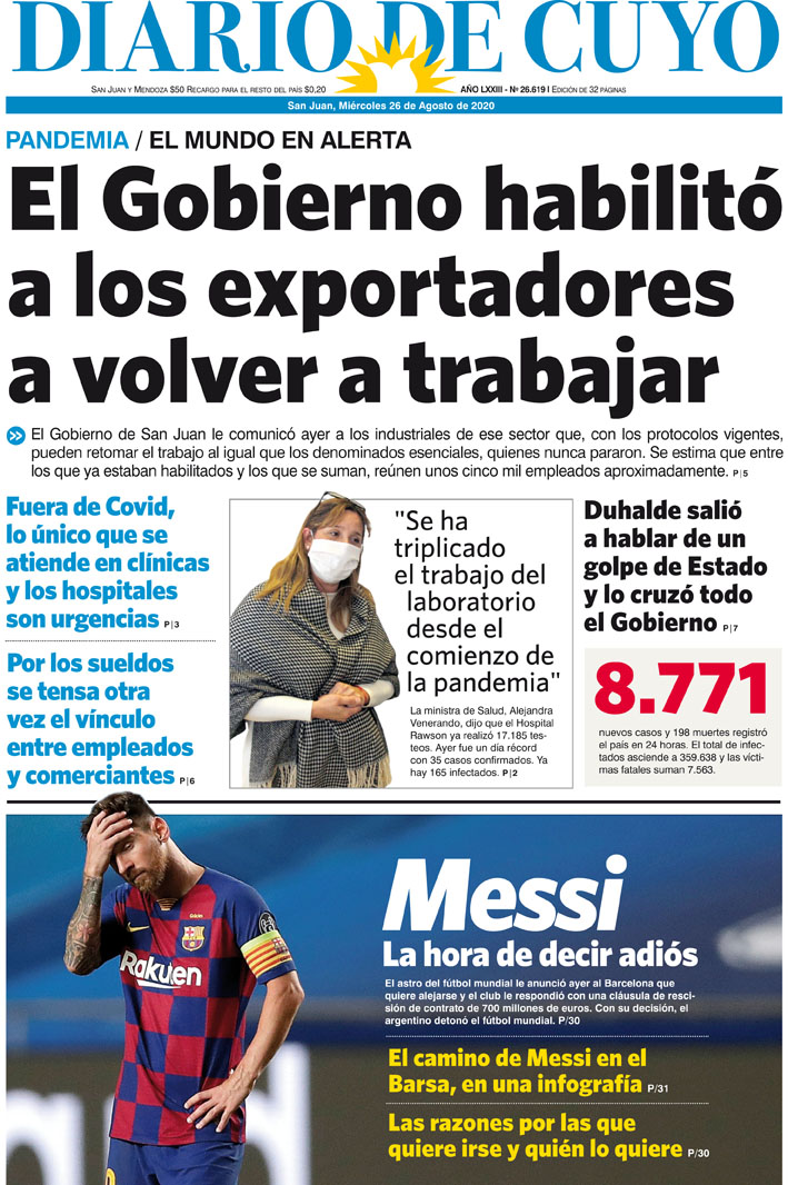 Diario de Cuyo | HOME | Noticias Tapa Edición 26 de Agosto del 2020 Por Redacción Diario de Cuyo 25/08/2020 · 0:00 Escuchar la noticia Escuchar la noticia Your browser doesn’t support HTML5 audio Ver los comentarios ›