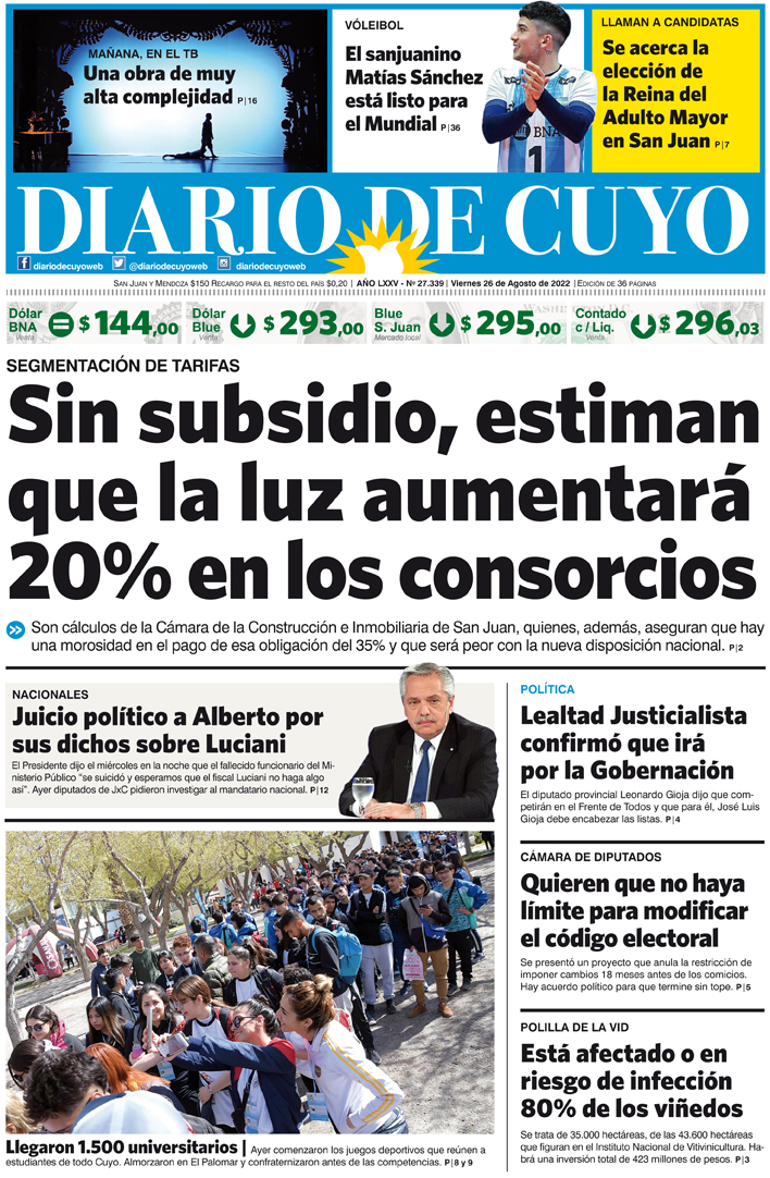 Diario de Cuyo | HOME | Noticias Tapa Edición 26 de Agosto del 2022 Por Redacción Diario de Cuyo 25/08/2022 · 0:00 Escuchar la noticia Escuchar la noticia Your browser doesn’t support HTML5 audio Ver los comentarios ›