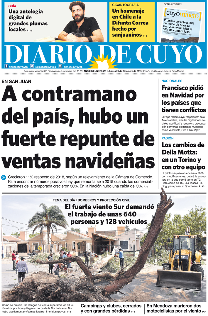 Diario de Cuyo | HOME | Noticias | Tapa Edición Tapa Edición 26 de Diciembre 2019 Por Redacción Diario de Cuyo 25/12/2019 · 0:00 Escuchar la noticia Escuchar la noticia Your browser doesn’t support HTML5 audio Tapa Edición Ver los comentarios ›