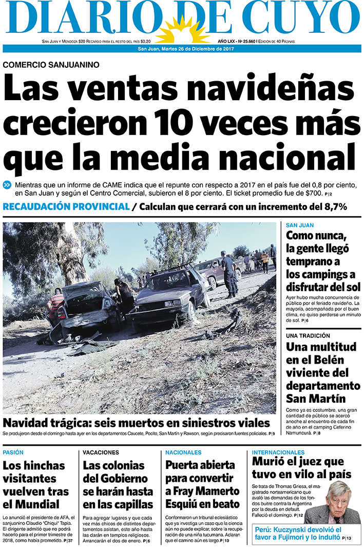 Diario de Cuyo | HOME | Noticias | Tapa Edición Tapa Edición 26 de Diciembre del 2017 Por Redacción Diario de Cuyo 25/12/2017 · 0:00 Escuchar la noticia Escuchar la noticia Your browser doesn’t support HTML5 audio Tapa Edición Ver los comentarios ›