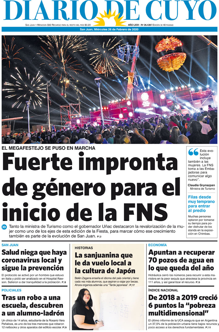 Diario de Cuyo | HOME | Noticias Tapa Edición 26 de Febrero del 2020 Por Redacción Diario de Cuyo 25/02/2020 · 0:00 Escuchar la noticia Escuchar la noticia Your browser doesn’t support HTML5 audio Ver los comentarios ›