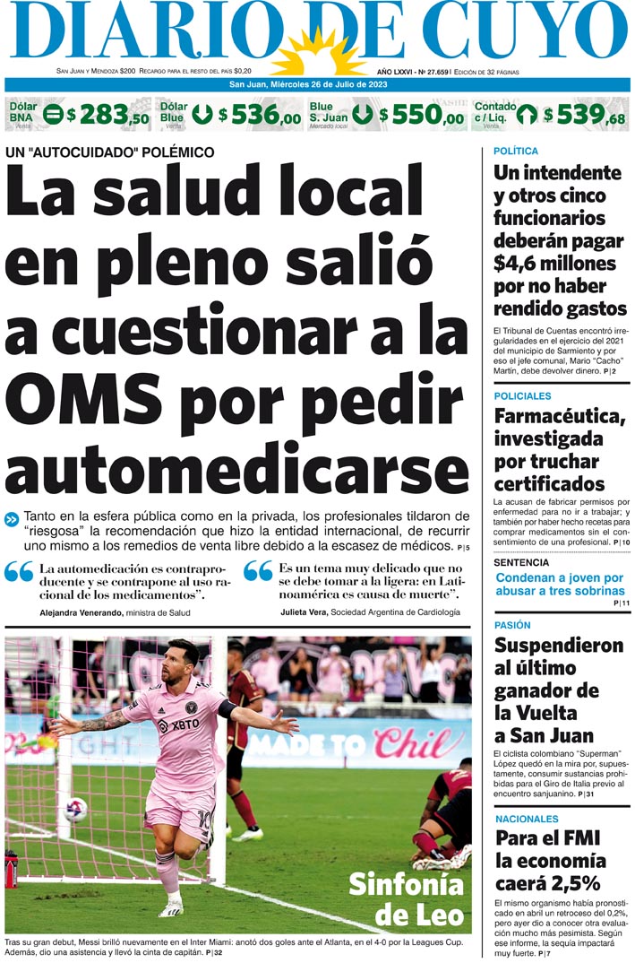 Diario de Cuyo | HOME | Noticias Tapa Edición 26 de Julio del 2023 Por Redacción Diario de Cuyo 26/07/2023 · 0:00 Escuchar la noticia Escuchar la noticia Your browser doesn’t support HTML5 audio Ver los comentarios ›
