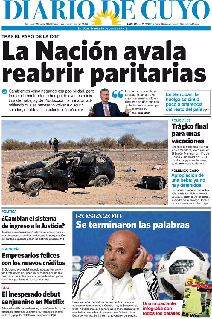 Diario de Cuyo | HOME | Noticias | Tapa Edición Tapa Edición 26 de Junio 2018 Por Redacción Diario de Cuyo 25/06/2018 · 0:00 Escuchar la noticia Escuchar la noticia Your browser doesn’t support HTML5 audio Tapa Edición Ver los comentarios ›