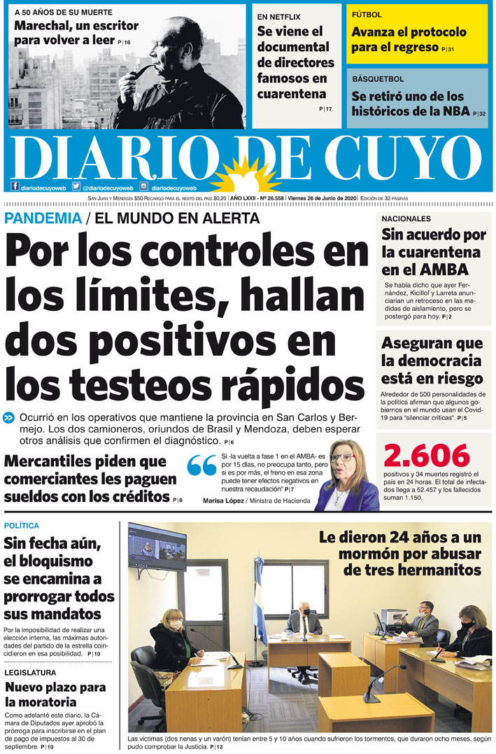 Diario de Cuyo | HOME | Noticias Tapa Edición 26 de Junio del 2020 Por Redacción Diario de Cuyo 25/06/2020 · 0:00 Escuchar la noticia Escuchar la noticia Your browser doesn’t support HTML5 audio Ver los comentarios ›