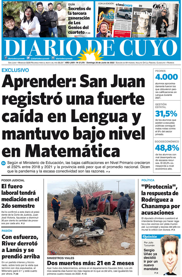 Diario de Cuyo | HOME | Noticias Tapa Edición 26 de Junio del 2022 Por Redacción Diario de Cuyo 25/06/2022 · 0:00 Escuchar la noticia Escuchar la noticia Your browser doesn’t support HTML5 audio Ver los comentarios ›