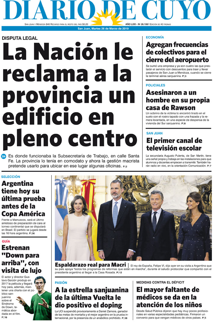 Diario de Cuyo | HOME | Noticias | Tapa Edición Tapa Edición 26 de Marzo 2019 Por Redacción Diario de Cuyo 25/03/2019 · 0:00 Escuchar la noticia Escuchar la noticia Your browser doesn’t support HTML5 audio Tapa Edición Ver los comentarios ›