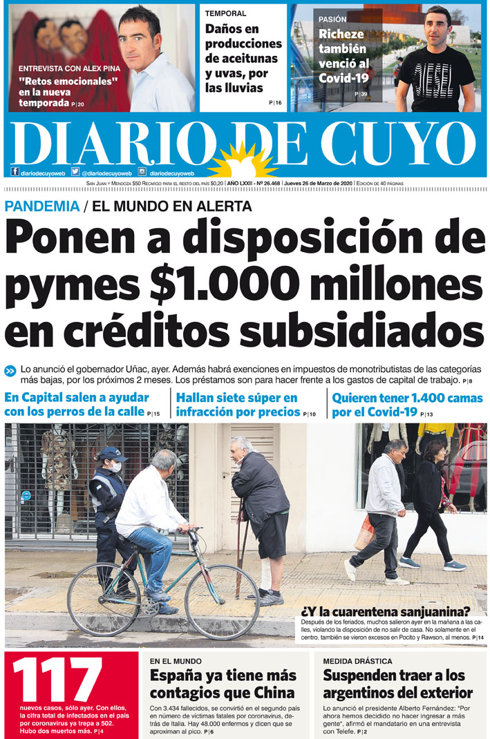 Diario de Cuyo | HOME | Noticias Tapa Edición 26 de Marzo del 2020 Por Redacción Diario de Cuyo 25/03/2020 · 0:00 Escuchar la noticia Escuchar la noticia Your browser doesn’t support HTML5 audio Ver los comentarios ›