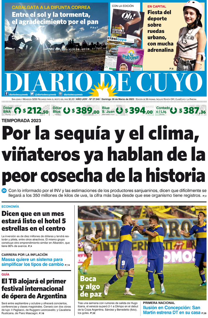 Diario de Cuyo | HOME | Noticias Tapa Edición 26 de Marzo del 2023 Por Redacción Diario de Cuyo 25/03/2023 · 0:00 Escuchar la noticia Escuchar la noticia Your browser doesn’t support HTML5 audio Ver los comentarios ›