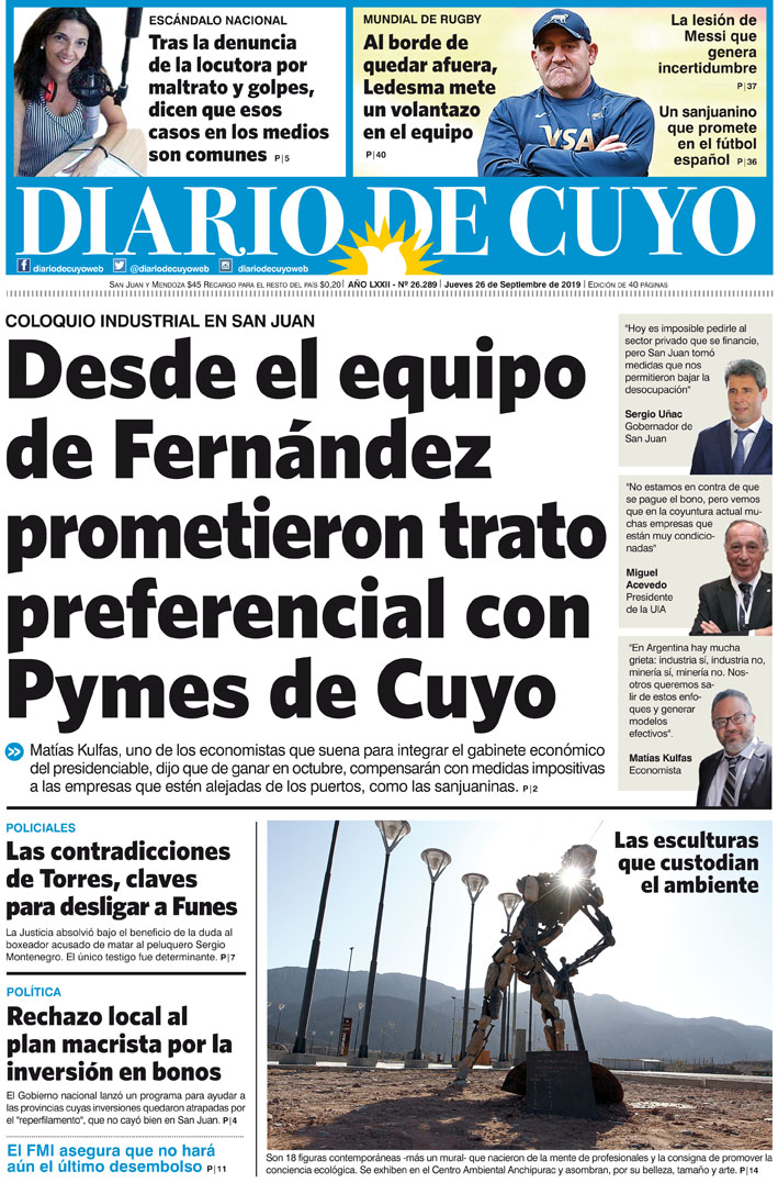 Diario de Cuyo | HOME | Noticias | Tapa Edición Tapa Edición 26 de Septiembre 2019 Por Redacción Diario de Cuyo 26/09/2019 · 0:00 Escuchar la noticia Escuchar la noticia Your browser doesn’t support HTML5 audio Tapa Edición Ver los comentarios ›