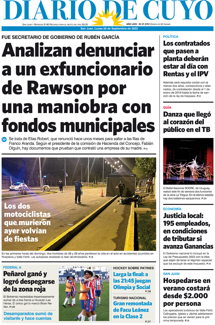 Diario de Cuyo | HOME | Noticias Tapa Edición 26 de Septiembre del 2022 Por Redacción Diario de Cuyo 25/09/2022 · 0:00 Escuchar la noticia Escuchar la noticia Your browser doesn’t support HTML5 audio Ver los comentarios ›