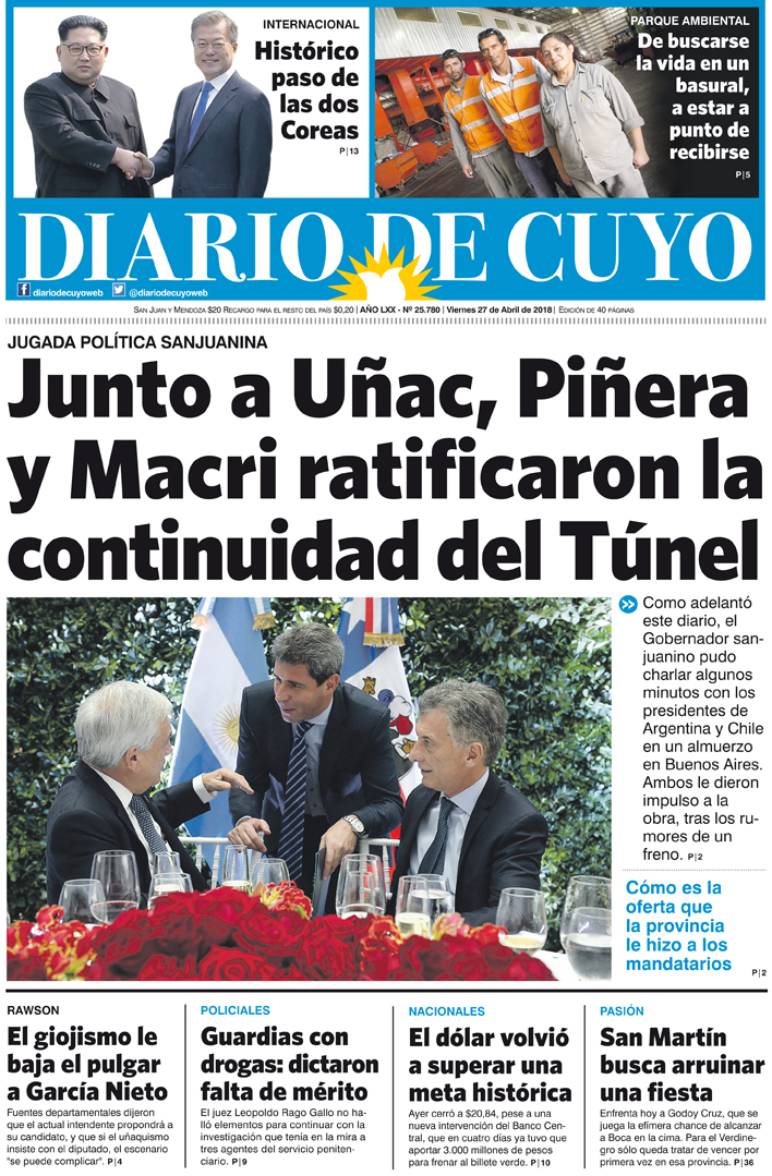 Diario de Cuyo | HOME | Noticias | Tapa Edición Tapa Edición 27 de Abril 2018 Por Redacción Diario de Cuyo 27/04/2018 · 0:00 Escuchar la noticia Escuchar la noticia Your browser doesn’t support HTML5 audio Tapa Edición Ver los comentarios ›