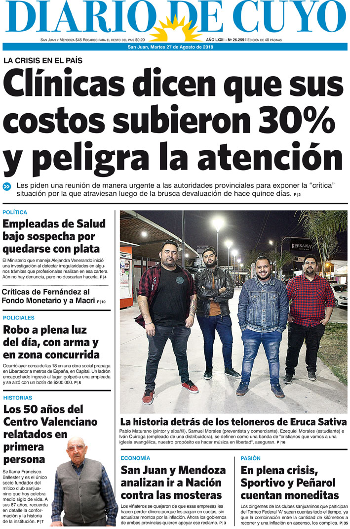 Diario de Cuyo | HOME | Noticias | Tapa Edición Tapa Edición 27 de Agosto 2019 Por Redacción Diario de Cuyo 26/08/2019 · 0:00 Escuchar la noticia Escuchar la noticia Your browser doesn’t support HTML5 audio Tapa Edición Ver los comentarios ›