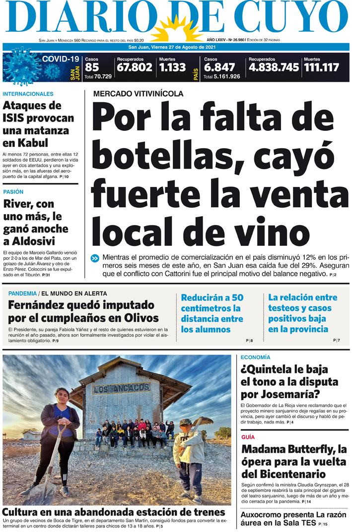 Diario de Cuyo | HOME | Noticias Tapa Edición 27 de Agosto del 2021 Por Redacción Diario de Cuyo 27/08/2021 · 0:00 Escuchar la noticia Escuchar la noticia Your browser doesn’t support HTML5 audio Ver los comentarios ›