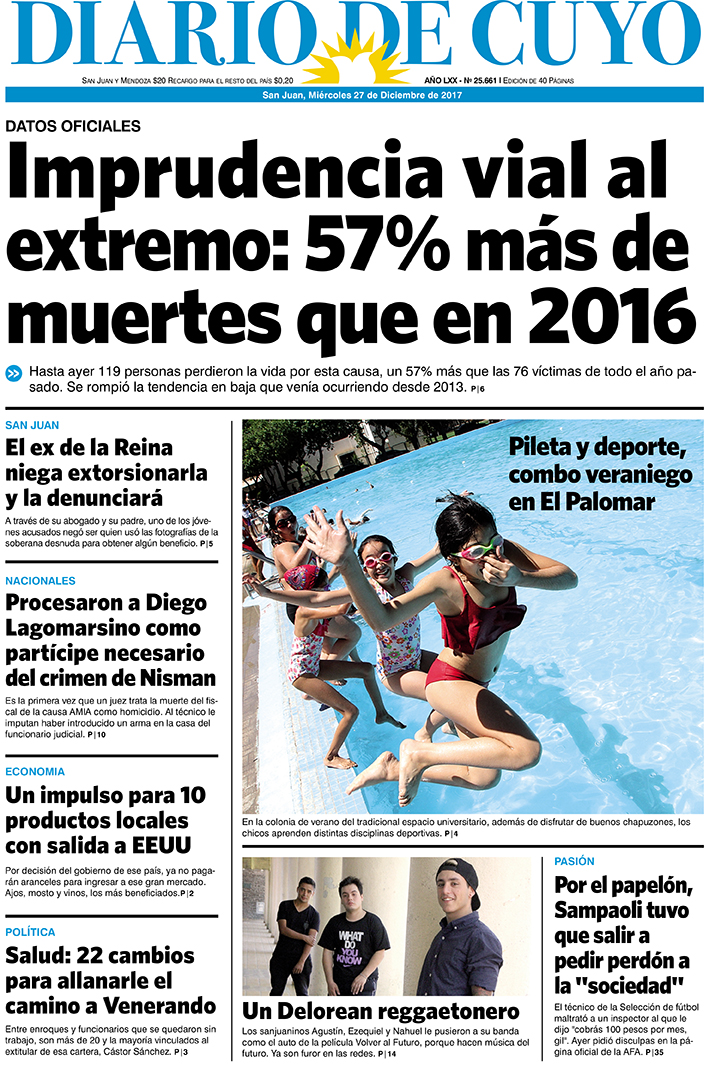 Diario de Cuyo | HOME | Noticias | Tapa Edición Tapa Edición 27 de Diciembre del 2017 Por Redacción Diario de Cuyo 26/12/2017 · 0:00 Escuchar la noticia Escuchar la noticia Your browser doesn’t support HTML5 audio Tapa Edición Ver los comentarios ›
