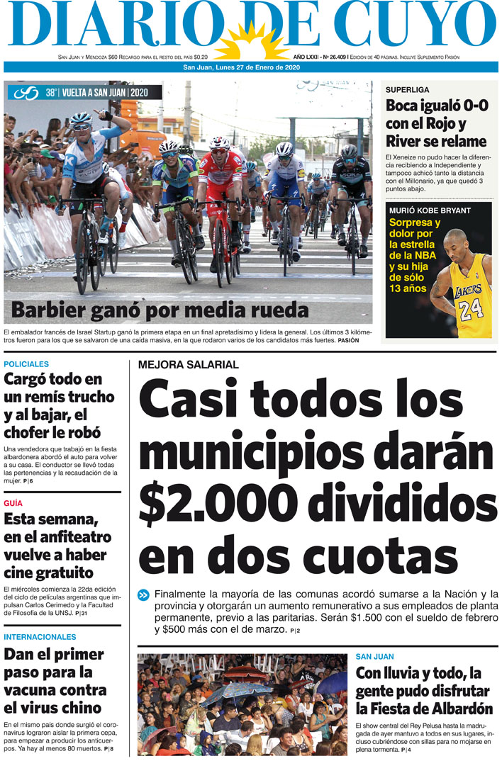 Diario de Cuyo | HOME | Noticias Tapa Edición 27 de Enero de 2020 Por Redacción Diario de Cuyo 27/01/2020 · 0:00 Escuchar la noticia Escuchar la noticia Your browser doesn’t support HTML5 audio Ver los comentarios ›