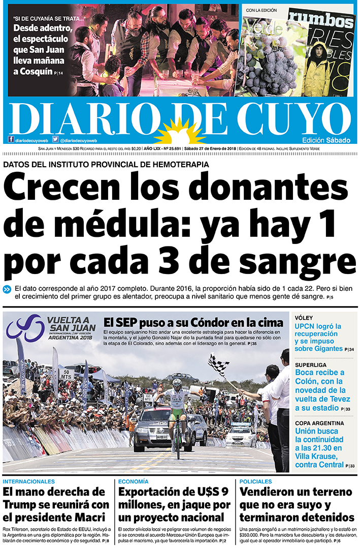 Diario de Cuyo | HOME | Noticias | Tapa Edición Tapa Edición 27 de Enero del 2018 Por Redacción Diario de Cuyo 27/01/2018 · 0:00 Escuchar la noticia Escuchar la noticia Your browser doesn’t support HTML5 audio Tapa Edición Ver los comentarios ›