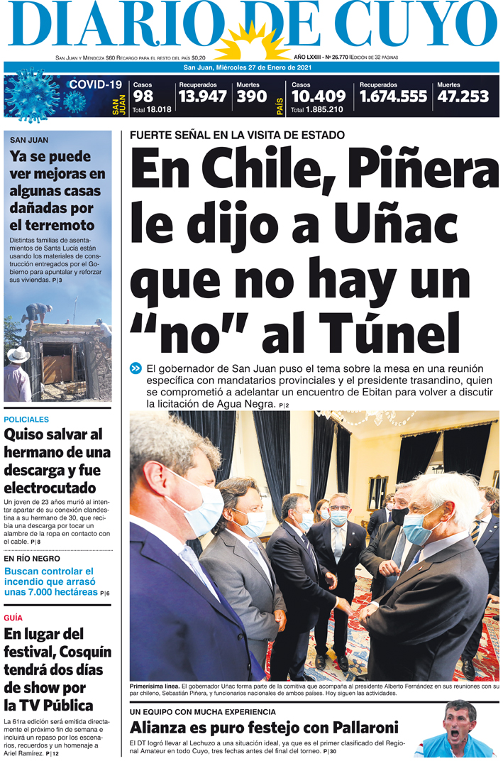 Diario de Cuyo | HOME | Noticias Tapa Edición 27 de Enero del 2021 Por Redacción Diario de Cuyo 26/01/2021 · 0:00 Escuchar la noticia Escuchar la noticia Your browser doesn’t support HTML5 audio Ver los comentarios ›