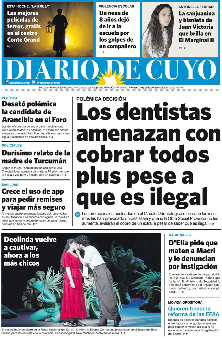 Diario de Cuyo | HOME | Noticias | Tapa Edición Tapa Edición 27 de Julio de 2018 Por Redacción Diario de Cuyo 26/07/2018 · 0:00 Escuchar la noticia Escuchar la noticia Your browser doesn’t support HTML5 audio Tapa Edición Ver los comentarios ›