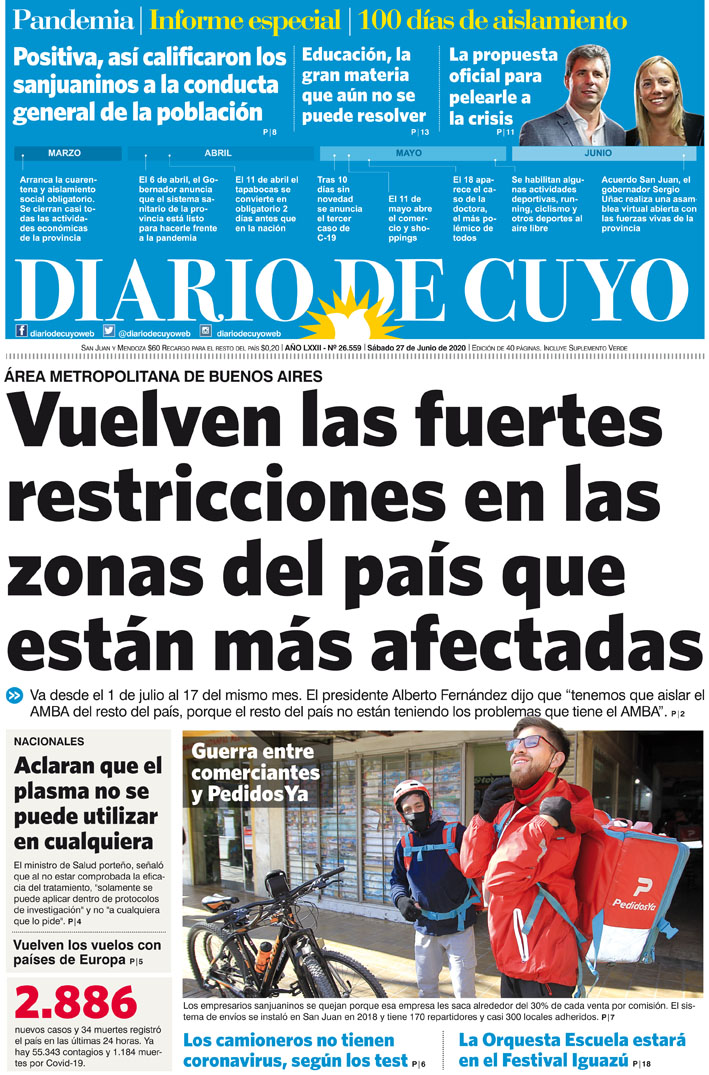 Diario de Cuyo | HOME | Noticias Tapa Edición 27 de Junio del 2020 Por Redacción Diario de Cuyo 26/06/2020 · 0:00 Escuchar la noticia Escuchar la noticia Your browser doesn’t support HTML5 audio Ver los comentarios ›