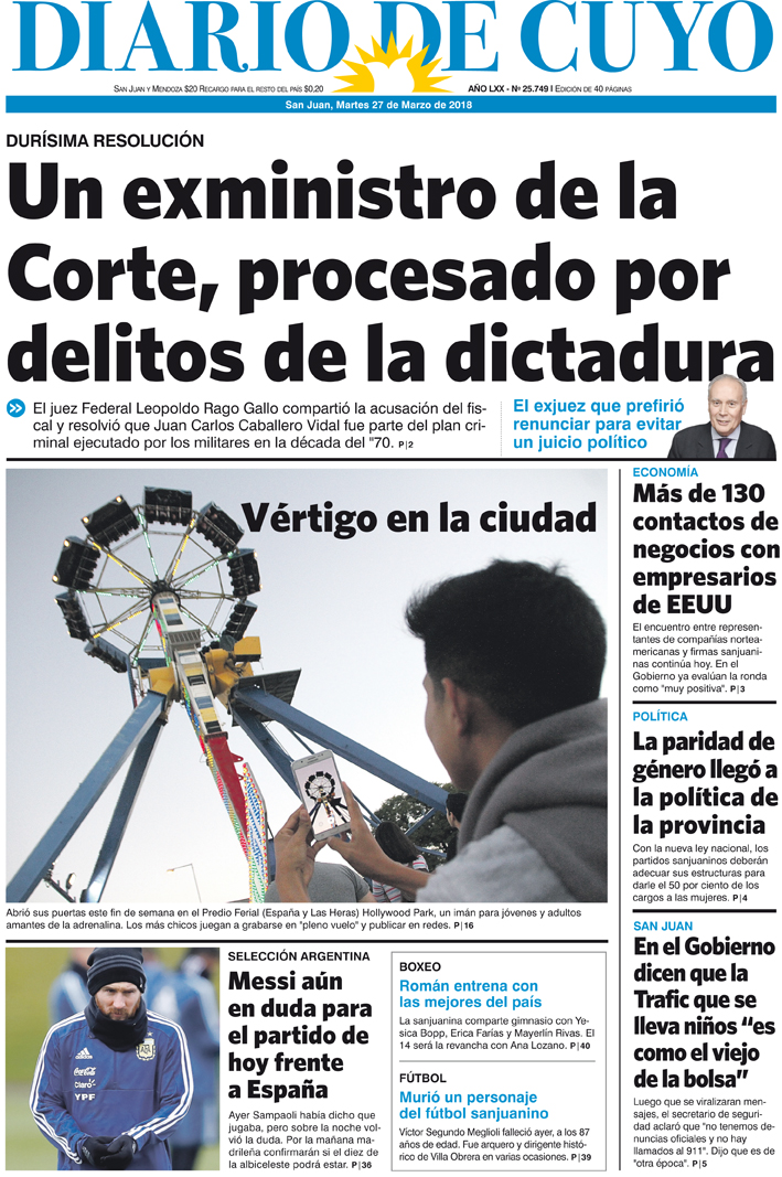 Diario de Cuyo | HOME | Noticias Tapa Edición 27 de Marzo del 2018 Por Redacción Diario de Cuyo 27/03/2018 · 0:00 Escuchar la noticia Escuchar la noticia Your browser doesn’t support HTML5 audio Ver los comentarios ›