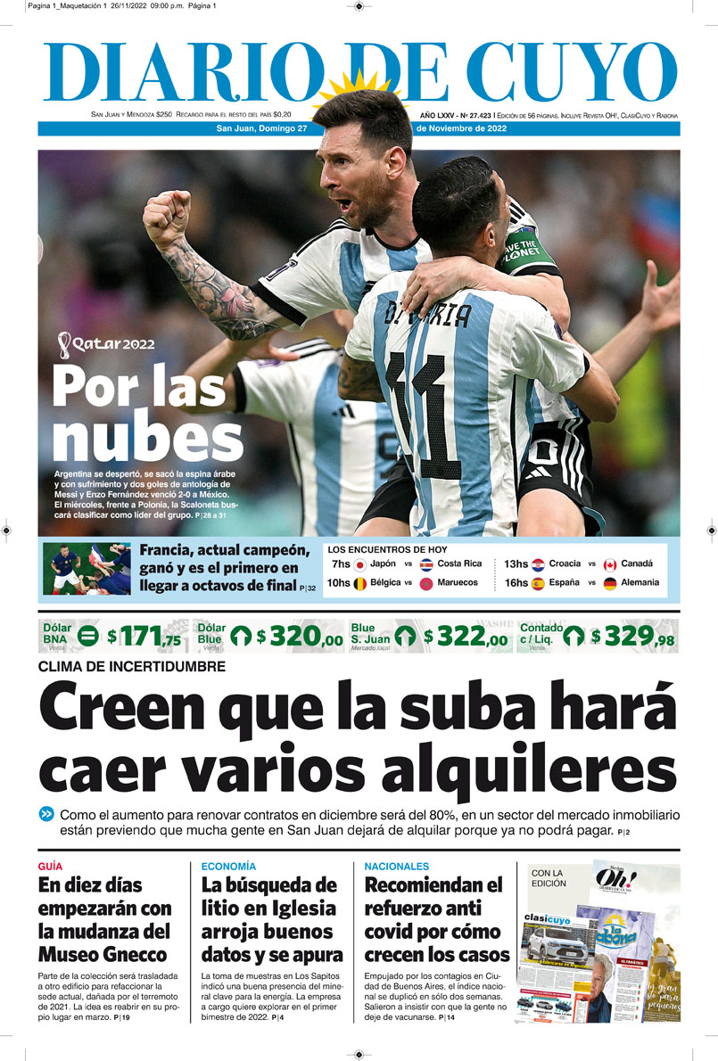 Diario de Cuyo | HOME | Noticias Tapa Edición 27 de Noviembre de 2022 Por Redacción Diario de Cuyo 27/11/2022 · 0:00 Escuchar la noticia Escuchar la noticia Your browser doesn’t support HTML5 audio Ver los comentarios ›