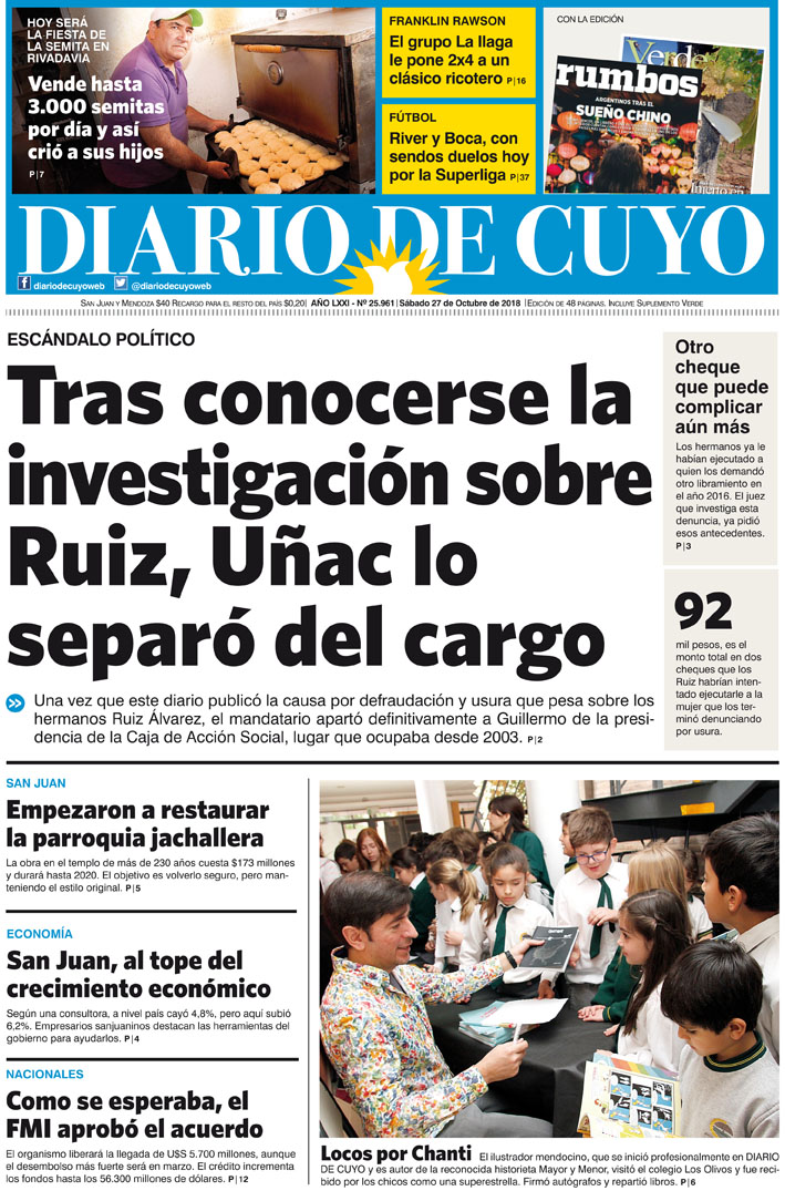 Diario de Cuyo | HOME | Noticias | Tapa Edición Tapa Edición 27 de Octubre 2018 Por Redacción Diario de Cuyo 26/10/2018 · 0:00 Escuchar la noticia Escuchar la noticia Your browser doesn’t support HTML5 audio Tapa Edición Ver los comentarios ›