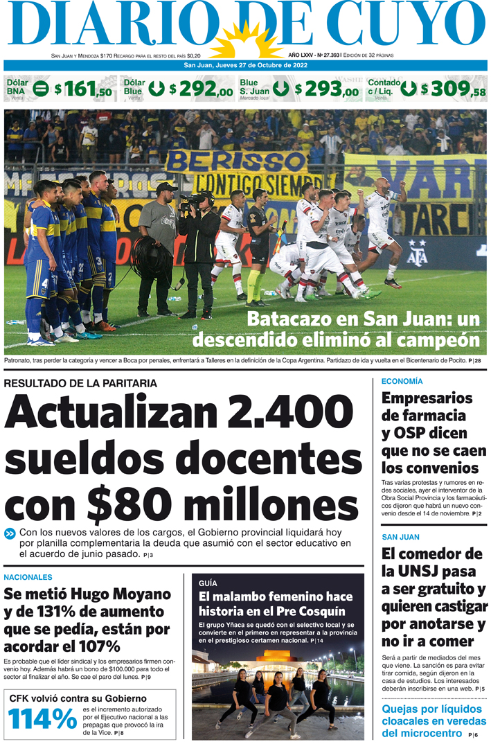 Diario de Cuyo | HOME | Noticias Tapa Edición 27 de Octubre del 2022 Por Redacción Diario de Cuyo 27/10/2022 · 0:00 Escuchar la noticia Escuchar la noticia Your browser doesn’t support HTML5 audio Ver los comentarios ›
