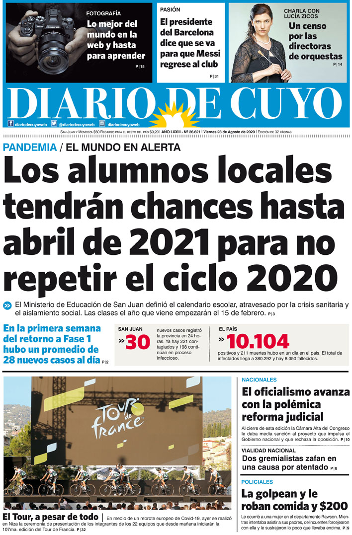 Diario de Cuyo | HOME | Noticias Tapa Edición 28 de Agosto del 2020 Por Redacción Diario de Cuyo 27/08/2020 · 0:00 Escuchar la noticia Escuchar la noticia Your browser doesn’t support HTML5 audio Ver los comentarios ›