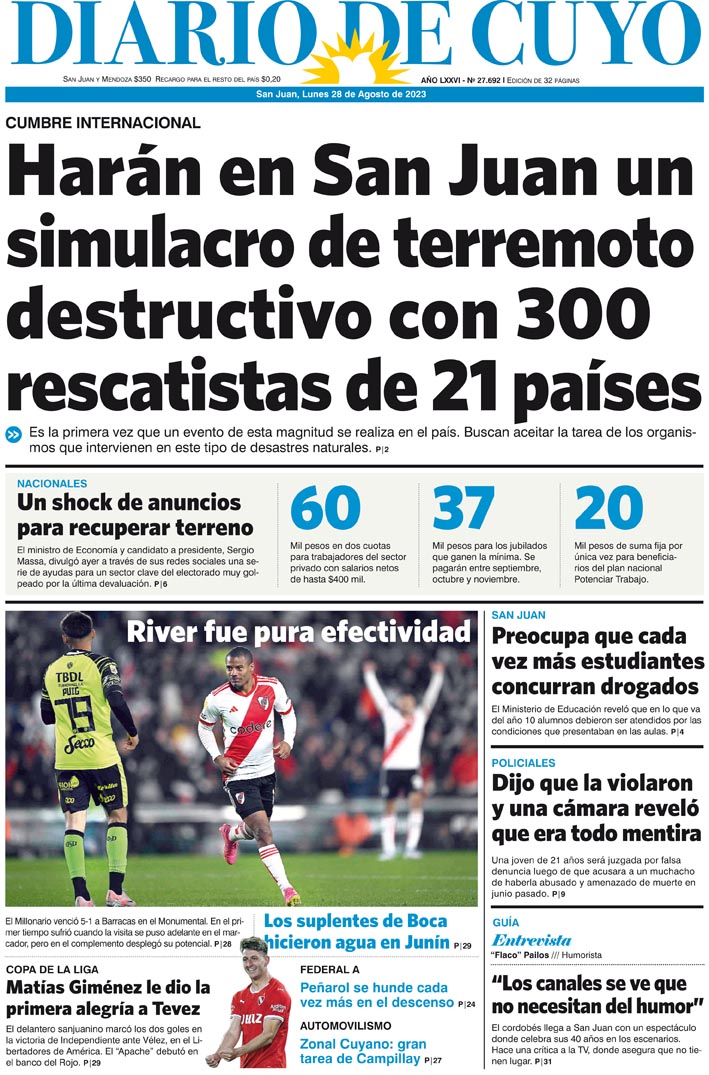 Diario de Cuyo | HOME | Noticias Tapa Edición 28 de Agosto del 2023 Por Redacción Diario de Cuyo 28/08/2023 · 0:00 Escuchar la noticia Escuchar la noticia Your browser doesn’t support HTML5 audio Ver los comentarios ›