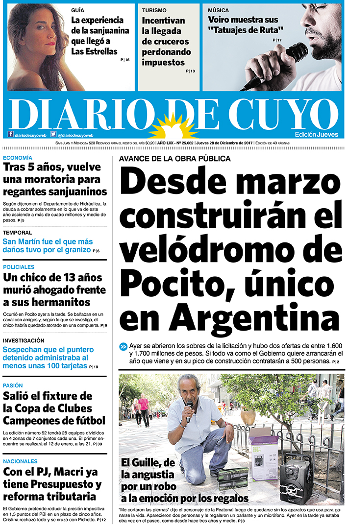 Diario de Cuyo | HOME | Noticias | Tapa Edición Tapa Edición 28 de Diciembre del 2017 Por Redacción Diario de Cuyo 27/12/2017 · 0:00 Escuchar la noticia Escuchar la noticia Your browser doesn’t support HTML5 audio Tapa Edición Ver los comentarios ›