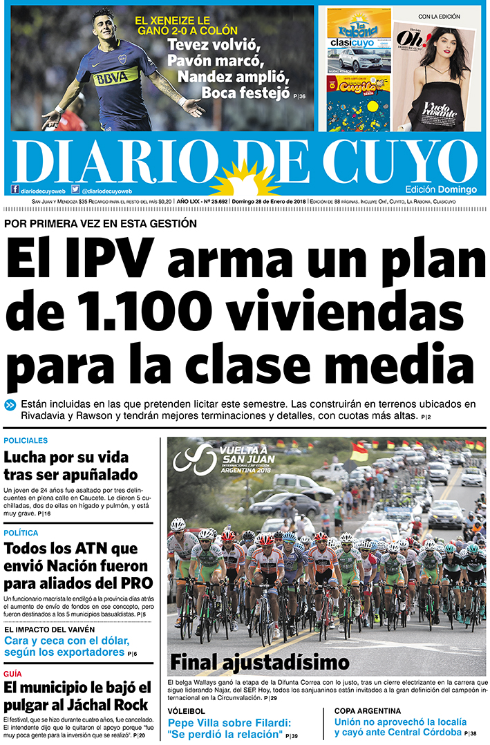 Diario de Cuyo | HOME | Noticias | Tapa Edición Tapa Edición 28 de Enero del 2018 Por Redacción Diario de Cuyo 28/01/2018 · 0:00 Escuchar la noticia Escuchar la noticia Your browser doesn’t support HTML5 audio Tapa Edición Ver los comentarios ›