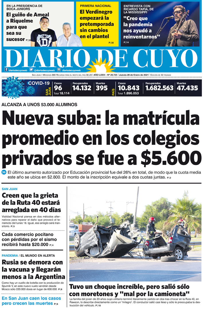 Diario de Cuyo | HOME | Noticias Tapa Edición 28 de Enero del 2021 Por Redacción Diario de Cuyo 27/01/2021 · 0:00 Escuchar la noticia Escuchar la noticia Your browser doesn’t support HTML5 audio Ver los comentarios ›