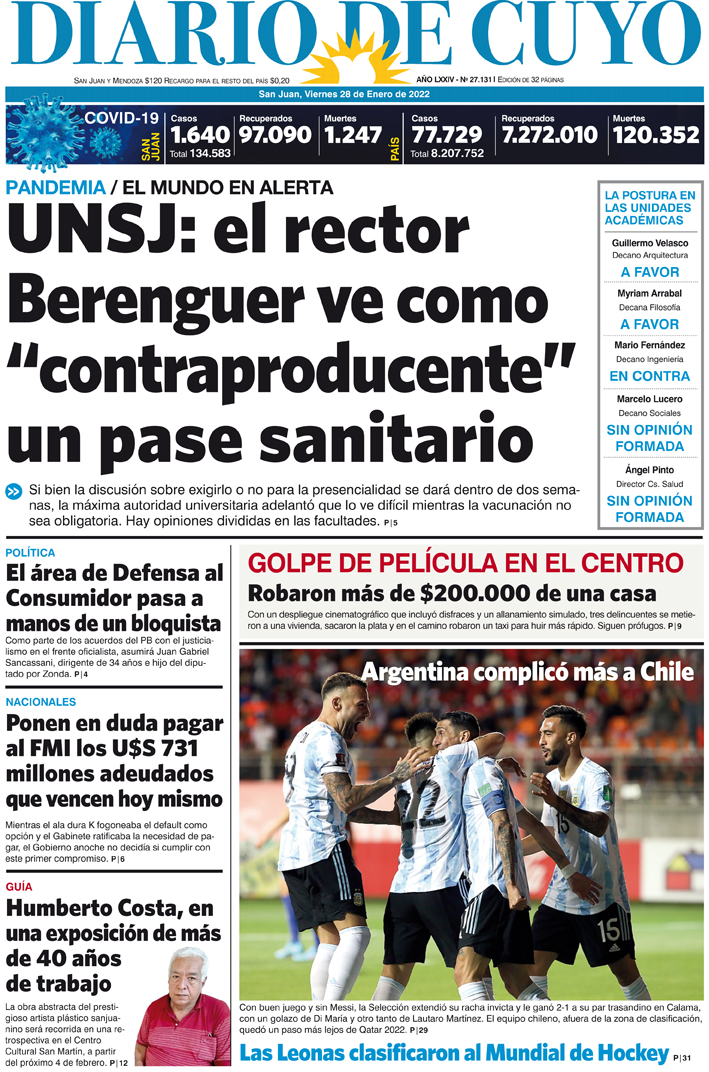 Diario de Cuyo | HOME | Noticias Tapa Edición 28 de Enero del 2022 Por Redacción Diario de Cuyo 28/01/2022 · 0:00 Escuchar la noticia Escuchar la noticia Your browser doesn’t support HTML5 audio Ver los comentarios ›
