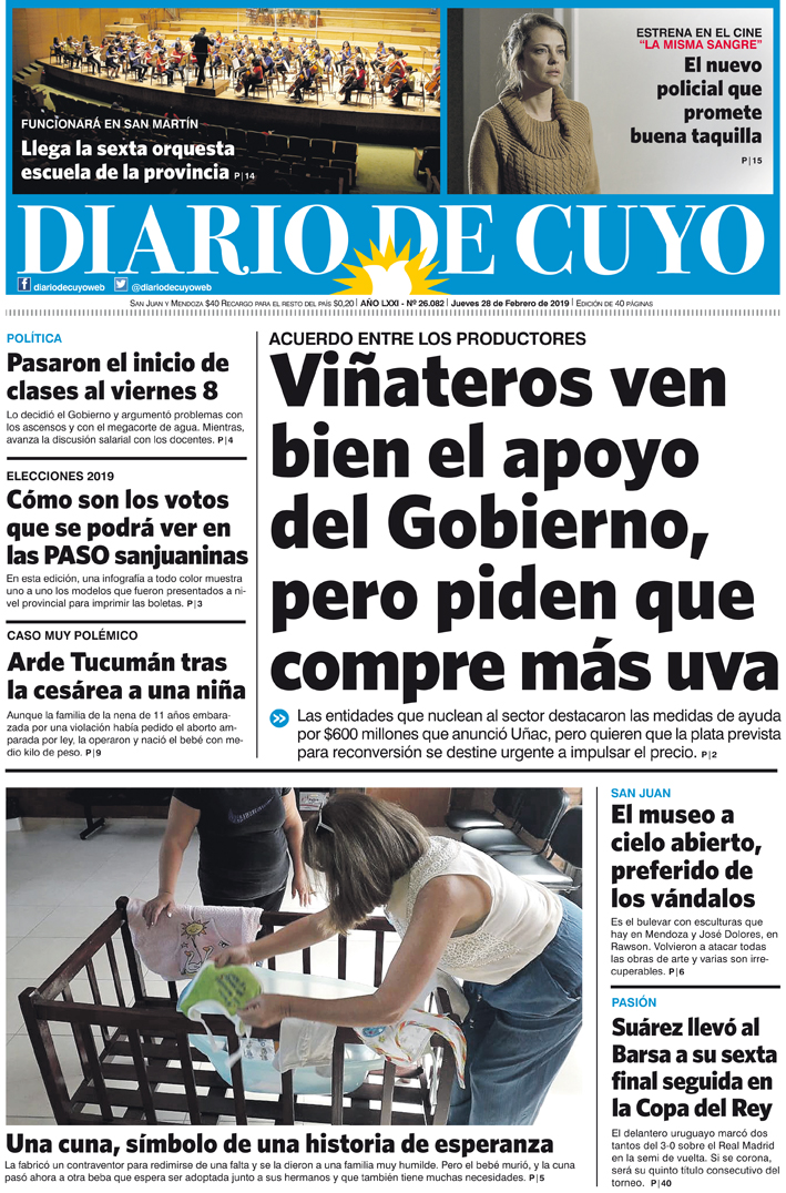 Diario de Cuyo | HOME | Noticias | Tapa Edición Tapa Edición 28 de Febrero 2019 Por Redacción Diario de Cuyo 27/02/2019 · 0:00 Escuchar la noticia Escuchar la noticia Your browser doesn’t support HTML5 audio Tapa Edición Ver los comentarios ›