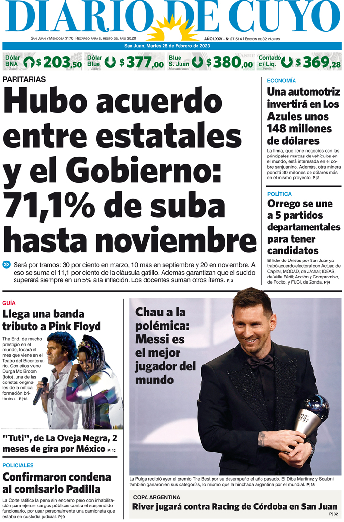 Diario de Cuyo | HOME | Noticias Tapa Edición 28 de Febrero del 2023 Por Redacción Diario de Cuyo 28/02/2023 · 0:00 Escuchar la noticia Escuchar la noticia Your browser doesn’t support HTML5 audio Ver los comentarios ›