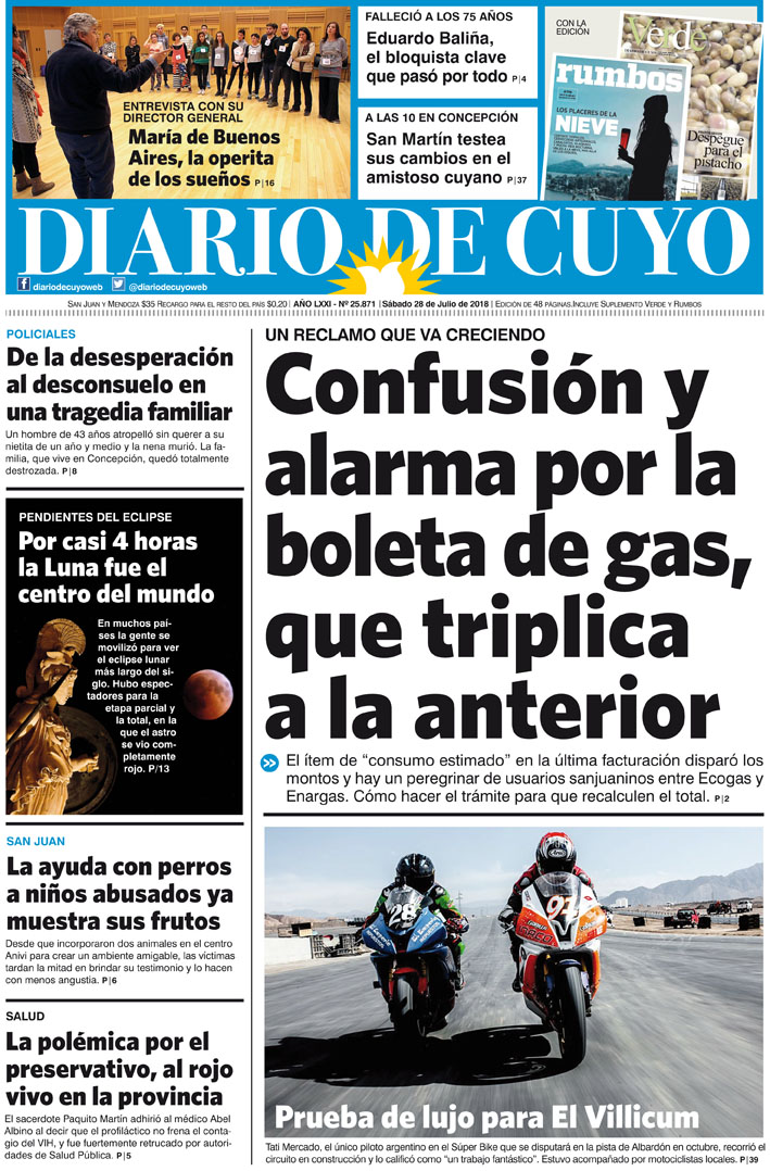 Diario de Cuyo | HOME | Noticias | Tapa Edición Tapa Edición 28 de Julio de 2018 Por Redacción Diario de Cuyo 27/07/2018 · 0:00 Escuchar la noticia Escuchar la noticia Your browser doesn’t support HTML5 audio Tapa Edición Ver los comentarios ›