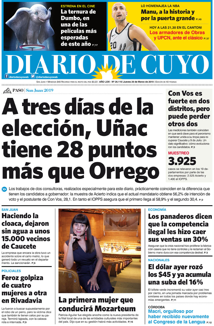 Diario de Cuyo | HOME | Noticias | Tapa Edición Tapa Edición 28 de Marzo 2019 Por Redacción Diario de Cuyo 27/03/2019 · 0:00 Escuchar la noticia Escuchar la noticia Your browser doesn’t support HTML5 audio Tapa Edición Ver los comentarios ›