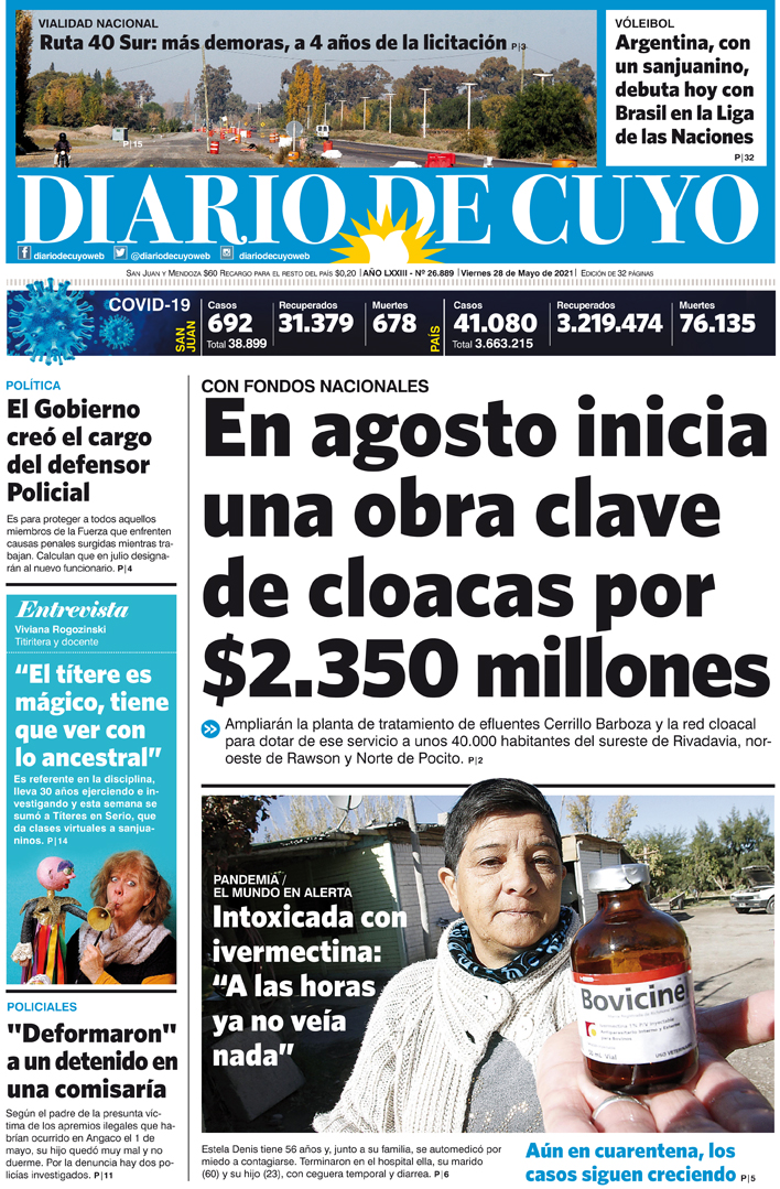 Diario de Cuyo | HOME | Noticias Tapa Edición 28 de Mayo del 2021 Por Redacción Diario de Cuyo 27/05/2021 · 0:00 Escuchar la noticia Escuchar la noticia Your browser doesn’t support HTML5 audio Ver los comentarios ›