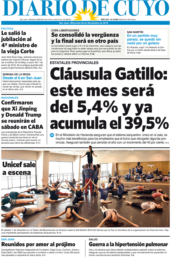 Diario de Cuyo | HOME | Noticias | Tapa Edición Tapa Edición 28 de Noviembre del 2018 Por Redacción Diario de Cuyo 27/11/2018 · 0:00 Escuchar la noticia Escuchar la noticia Your browser doesn’t support HTML5 audio Tapa Edición Ver los comentarios ›