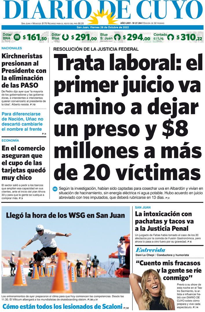 Diario de Cuyo | HOME | Noticias Tapa Edición 28 de Octubre del 2022 Por Redacción Diario de Cuyo 28/10/2022 · 0:00 Escuchar la noticia Escuchar la noticia Your browser doesn’t support HTML5 audio Ver los comentarios ›