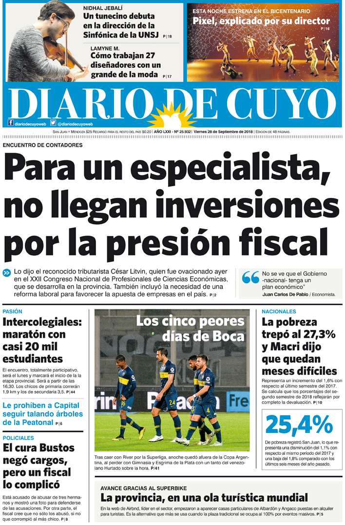 Diario de Cuyo | HOME | Noticias | Tapa Edición Tapa Edición 28 de Septiembre 2018 Por Redacción Diario de Cuyo 27/09/2018 · 0:00 Escuchar la noticia Escuchar la noticia Your browser doesn’t support HTML5 audio Tapa Edición Ver los comentarios ›